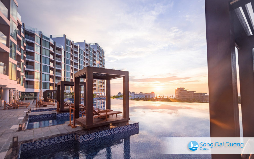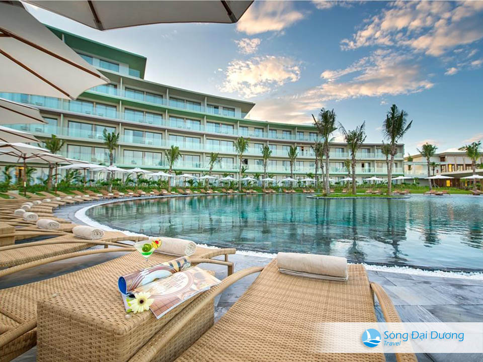 Mang thiết kế hình cánh cung tinh tế, độc đáo ôm trọn bể bơi nước mặn lớn nhất Đông Nam Á, đồng thời tất cả các phòng tại khách sạn đều hướng ra view biển mà không vướng bất cứ gì, vô cùng đẹp mắt.