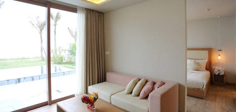 Phòng Seaview Living thuộc khu nhà vườn nhiệt đới liên kề, có tổng số 17 căn được thiết kế theo tiêu chuẩn 5* với tổng diện tích căn lên tới 159m2. Biệt thự nằm ngay cạnh bở biển, ngồi trong phòng thôi bạn cũng có thể thoải mái ngắm bở biển mộng mơ, xinh đẹp.